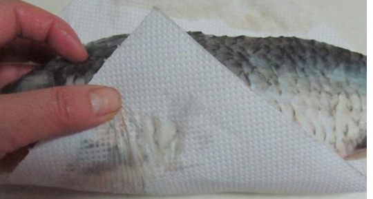 海水鱼如果用水清洗过后,会因为渗透压的不同,造成鱼肉的鲜味流失,厨房纸巾可以帮忙锁住海水鱼的鲜味。刚买回家的鱼在还没送进冰箱前,把厨房纸巾多次对折成小块的形状,用硬角的部分刮除鱼肚里残余的组织,减少鱼腥味。