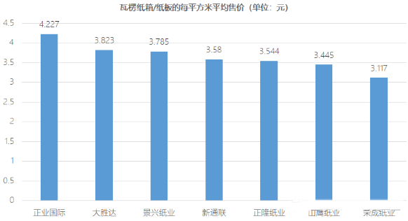 正隆纸业在2019年年报中指出,其纸板内销量约6.47亿平方米,总销售额约21.68亿元,纸板每平方米的平均售价约3.35元。其纸板外销量约2.84亿平方米,总销售额约8.72亿元,每平方米的平均售价约3.068元。其纸箱内销量约10.45亿平方米,总销售额约37.02亿元,瓦楞纸箱每平方米的平均售价约3.544元。其纸板外销量约3.26亿平方米,总销售额约14.24亿元,纸板每平方米的平均售价约4.368元。