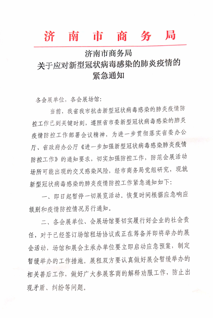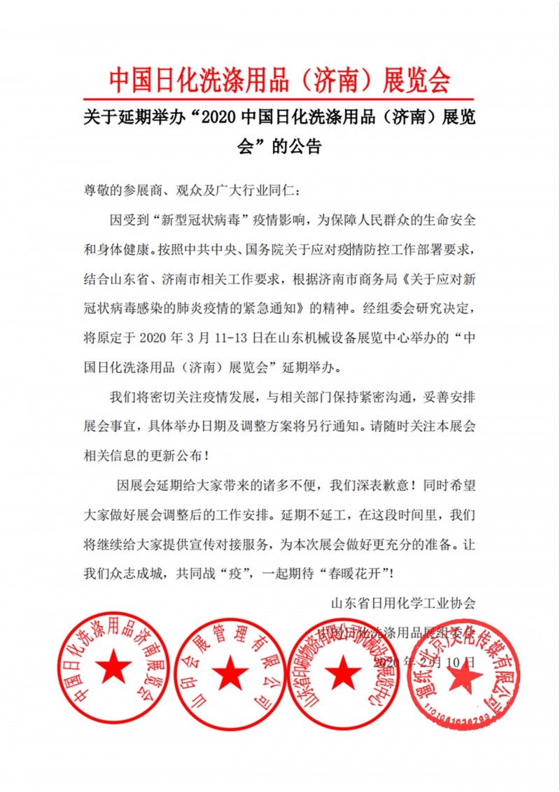关于“2020山东生活用纸展延期举办”的通告关于“2020中国日化洗涤用品(济南)展览会延期举办”的通告