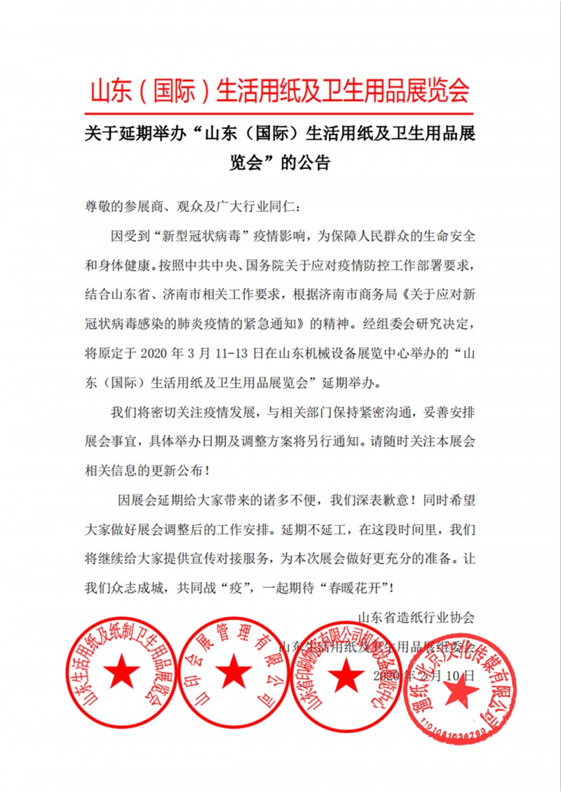 关于“2020山东生活用纸展延期举办”的通告、“2020中国日化洗涤用品(济南)展览会延期举办”的通告